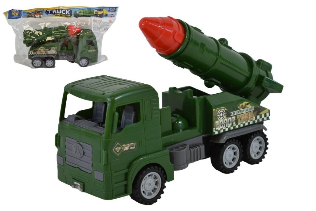 Camión militar con cohete. Medida del camion: 23x11cm. Material: Plástico. Presentación: En bolsa. Disponible en color verde.