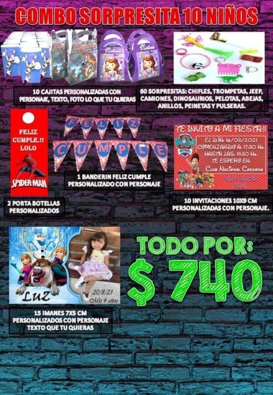 10 invitaciones 10 x 9 cm personalizadas con personaje