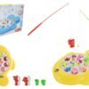 Juego de pesca con sonido y movimiento. Con forma de pez. Presentación en tres colores: amarillo, azul y rosado. Ideal para la estimulación del tacto y la visión. Para dos jugadores. Contiene dos cañas de pescar y 15 peces de dos tamaños diferentes y diferentes colores. Funciona a pila