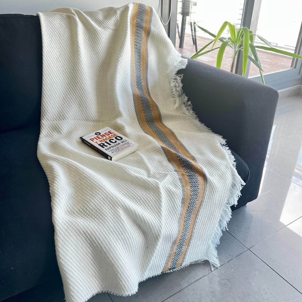 Fabricada en una suave mezcla de algodón e hilo, su textura es agradable al tacto, lo que la convierte en un complemento ideal para esos momentos de relax. Su diseño con flecos añade un detalle decorativo que realza la estética de tu sala de estar o dormitorio, integrándose fácilmente con diferentes estilos de decoración.