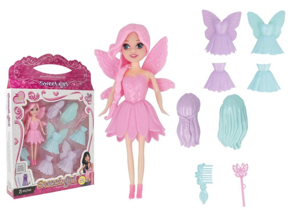 Muñeca angel con 3 vestidos y 3 pelucas para cambiar