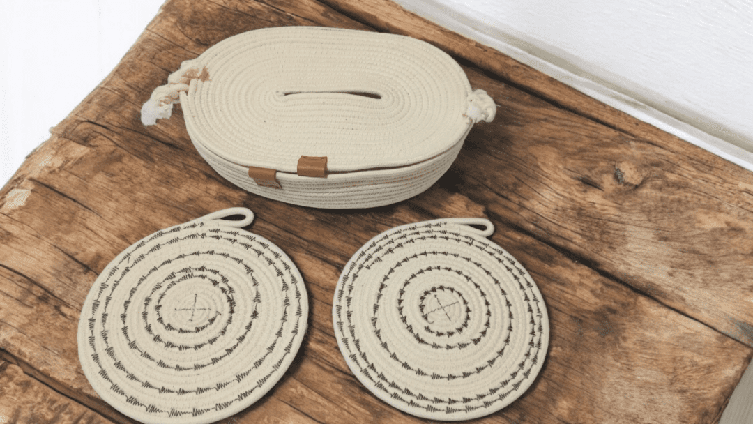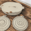Hermoso Servilletero de 22 cm diametro por 5 cm alto y 2 posavasos de 13 cm diametro, confeccionado en cordon de algodon posavasos con bordado en color negro, ideal para decorar tu mesa